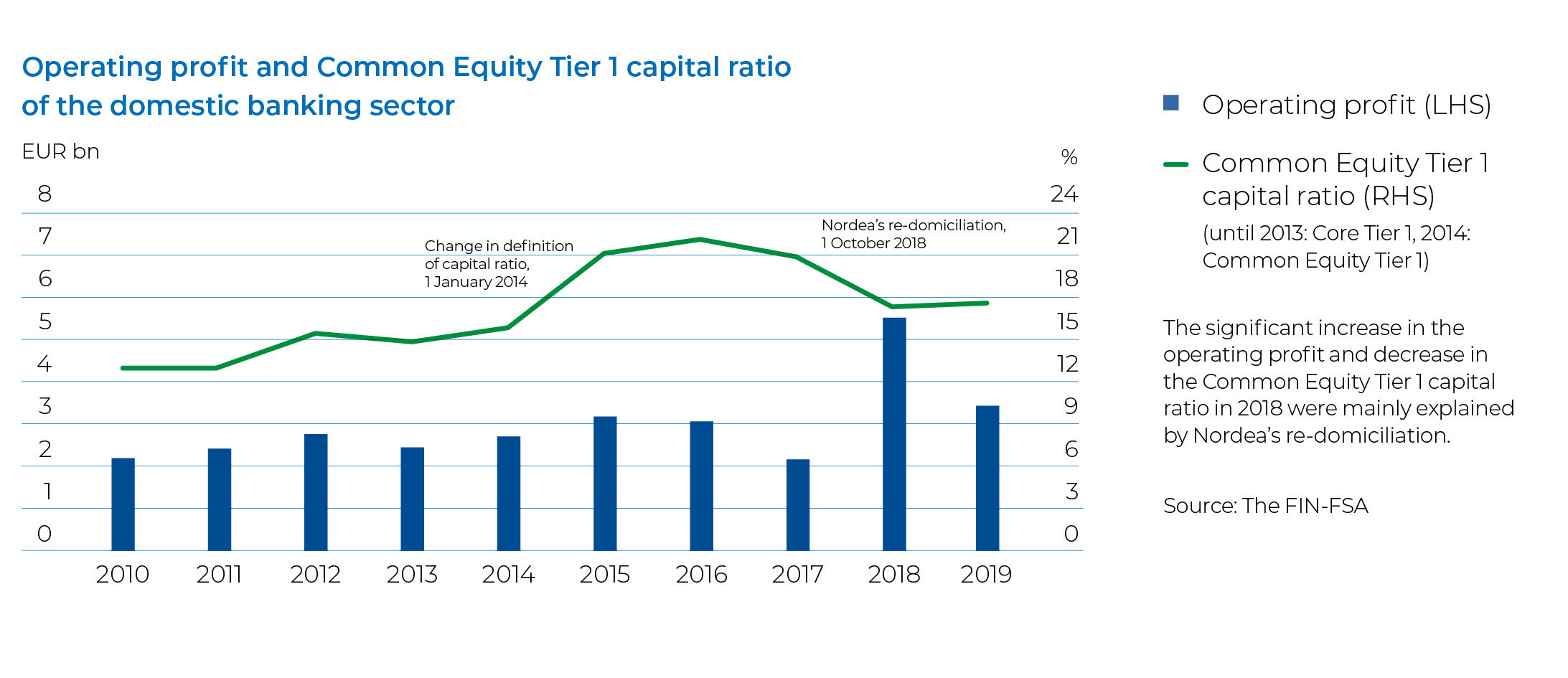 Risks in the operating environment of Finnish banks increased in the review year. This was due to elevated risks related to international economic development and reduced confidence among domestic companies and households. Despite the economic uncertainty, the capital adequacy of the Finnish banking sector and the quality of the credit stock remained strong. The risk-weighted capital ratios of the Finnish banking sector strengthened and remained above the European average. The non-risk-weighted leverage ratio also strengthened slightly and was higher than the average level for banks within the EU area. Finnish banks’ non-performing loans remained low in the review year. The level of non-performing loans in Finland is among the lowest in Europe.