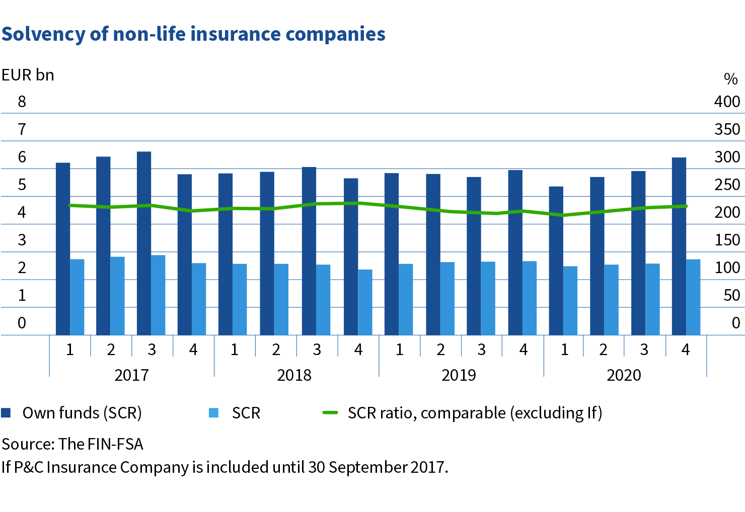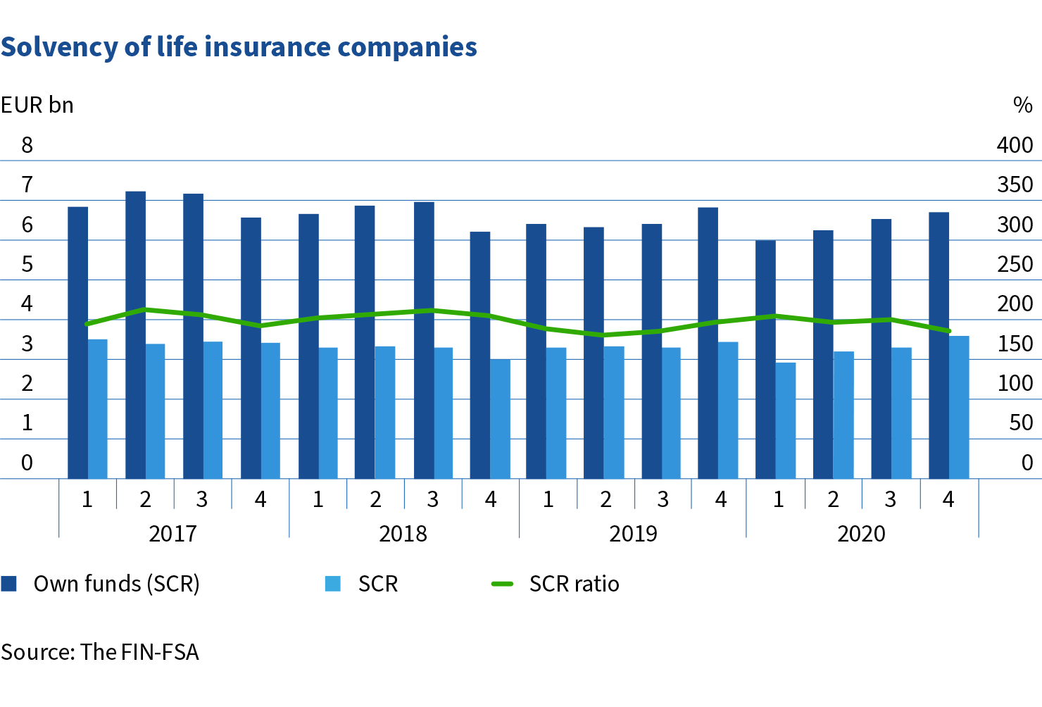 The solvency ratio of the life insurance sector remained at a good level, although it declined clearly from a year earlier. Own funds decreased and the solvency capital requirement increased. The interest rate level, which declined significantly during the year, increased the amount of technical provisions. Good returns on higher-risk investments increased the capital requirement for market risk. Life insurance companies’ investment returns recovered during 2020 and ended up clearly positive.