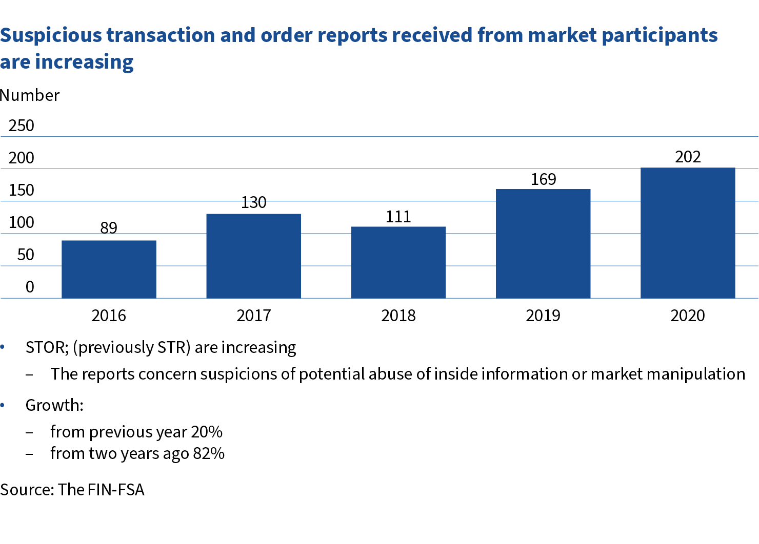 Trading venues and intermediaries are under a regulatory obligation to report suspicious activity in trading to the FIN-FSA. In 2020, the supervisor received approximately 200 suspicious transaction and order reports (STORs), representing growth of almost 20% from the previous year and over 100% from four years ago. The public also reports suspicious activity to the FIN-FSA.