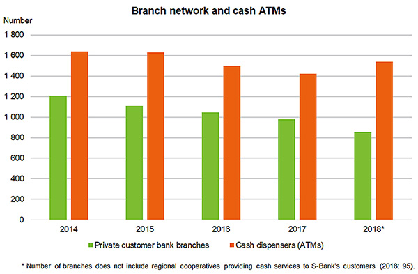 The total number of branches includes S-Bank’s customer service points in regional cooperative stores (2022: 94), the number of which was previously reported separately in the surveys.