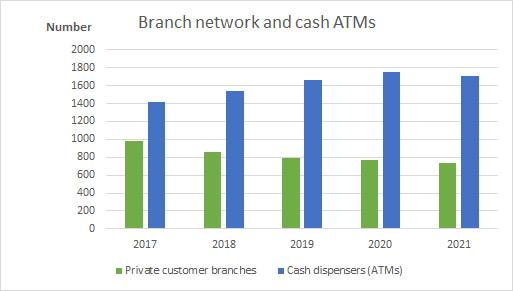 The branch network has been significantly reduced in recent years, and this year there were 790 branches providing services to retail customers. The number of branches providing cash services on a full-time basis has also decreased. Only around 27% of branches serve customers full-time and also provide cash services throughout their opening hours. One-in-five branches provide no cash services at all.