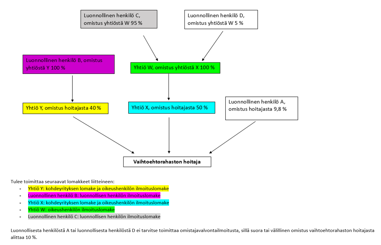 Lomakkeet tulee toimittaa kaikista niistä, jotka omistavat vähintään 10 % (suoraan tai välillisesti) rekisteröityneestä vaihtoehtorahaston hoitajasta. Lomakkeet tulee toimittaa sekä oikeushenkilöistä (esim. yhtiö, joka omistaa rekisteröitynyttä AIFMia) ja/tai luonnollisista henkilöistä (omistaa suoraan tai välillisesti esim. omistamansa yhtiön kautta rekisteröitynyttä AIFMia), koko omistusketjun loppuun asti kaikista vähintään 10%:n omistajista.