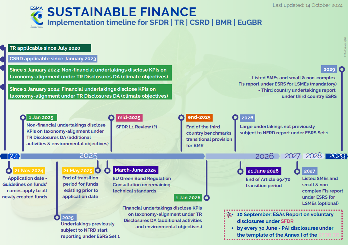 Avaa tästä(PDF) ESMA:n kestävän rahoituksen sääntelyä koskeva aikataulu ja ESMAn kestävän rahoituksen tiekartta(PDF).