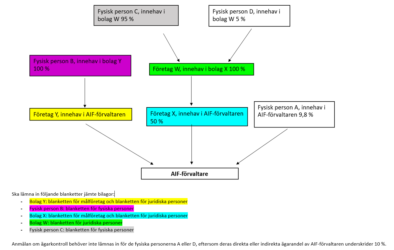 Blanketter ska lämnas in för alla dem som äger minst 10 % (direkt eller indirekt) av AIF-förvaltaren. Blanketter ska lämnas in för både juridiska (t.ex. ett företag, som äger AIF-förvaltaren) och fysiska personer (äger direkt eller inderekt AIF-förvaltaren, t.ex. genom företaget de äger) och de ska täcka alla led i ägarkedjan med en ägarandel på minst 10 %.