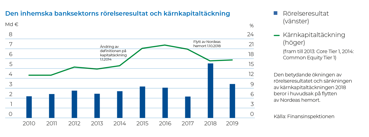 Banksektorns rörelsevinst minskade från året innan. Banksektorns resultat belastades framför allt av avskrivningar av engångskaraktär och nedskrivningar. Räntenettot ökade något från nivån 2018, när kreditstockens tillväxt kompenserade marknadsräntornas och marginalsänkningarnas negativa inverkan på ränteintäkter. Försämringen av rörelseresultat dämpades delvis ner av de lägre personalkostnaderna.