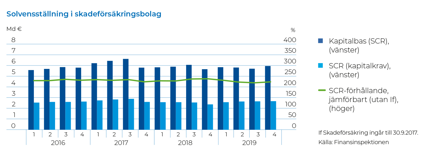 Skadeförsäkringsbolagens solvens förblev bra under berättelseåret, även om den sjönk från rekordnivån i slutet av 2018. Orsaken till försvagningen var höjningen av solvenskravet till följd av aktieprisernas ökning. Därtill förblev ökningen av kapitalbasen blygsam, eftersom den negativa effekten av försäkringstekniska avsättningars ökning undergrävde investeringsmarknadsprisutvecklingens positiva inverkan på kapitalbasen.