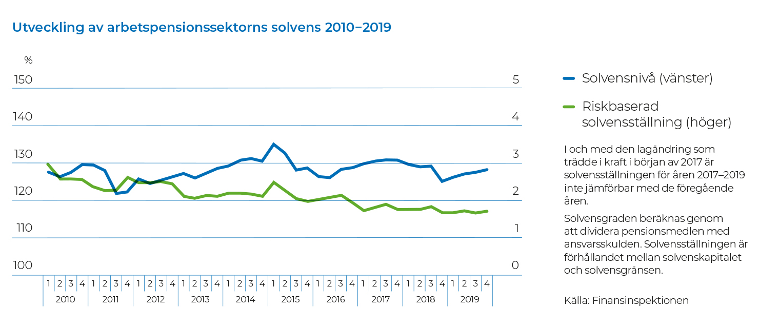 Arbetspensionssektorns solvensgrad, dvs. pensionsmedlens förhållande till ansvaren, förbättrades under hela berättelseåret. Bakom detta låg investeringsavkastningen, som överskred ansvarsskuldens avkastningskrav. Den påverkades framför allt av aktiemarknadens starka utveckling men även av den positiva avkastningen från andra investeringskategorier. Risken i förhållande till solvenskapitalet förändrades inte märkbart under året. Aktiernas andel som den största investeringskategorin fortsatte att öka till 46,6 procent samtidigt som ränteinvesteringarnas andel minskade. Arbetspensionsbolagens premieinkomst ökade till följd av lönesummans ökning.